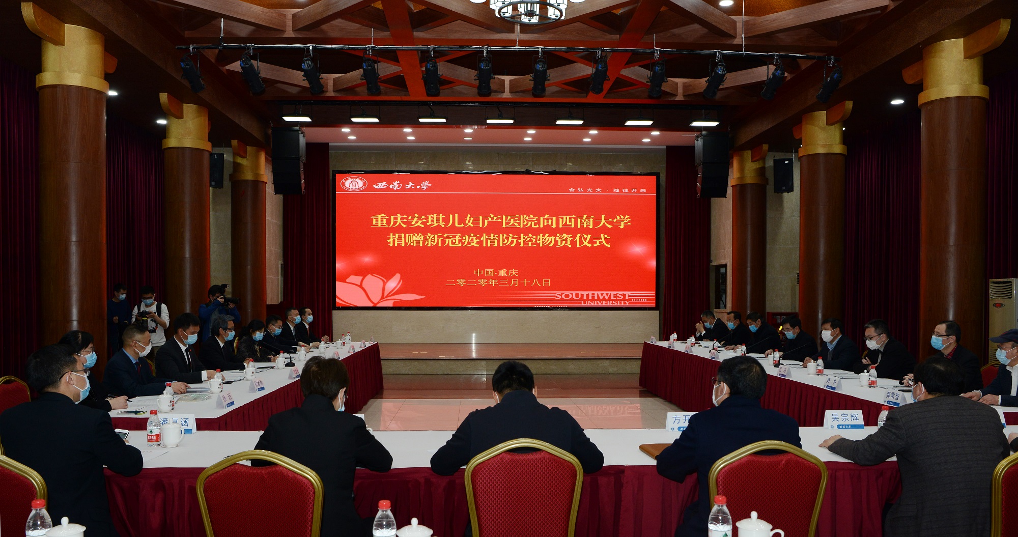 3月18日,安琪儿医疗控股集团旗下重庆安琪儿妇产医院向Beat365中文官方网站捐赠新冠疫情防控物资仪式在东方红会议厅举行。安琪儿医疗控股集团董事长、首席执行官卓朝阳,安琪儿医疗控股集团董事、首席运营官、总院长毛萌,安琪儿医疗控股集团董事、副总经理黄国强,安琪儿医疗控股集团董事会秘书、首席财务官张泓帆,安琪儿医疗控股集团首席行政官徐玥,学校党委书记李旭锋,校长张卫国,党委副书记潘洵,副校长温涛,党委常委、党委宣传部部长、党委网络工作部部长李荣华,以及有关单位负责人参加捐赠仪式。党委副书记潘洵主持捐赠仪式。
