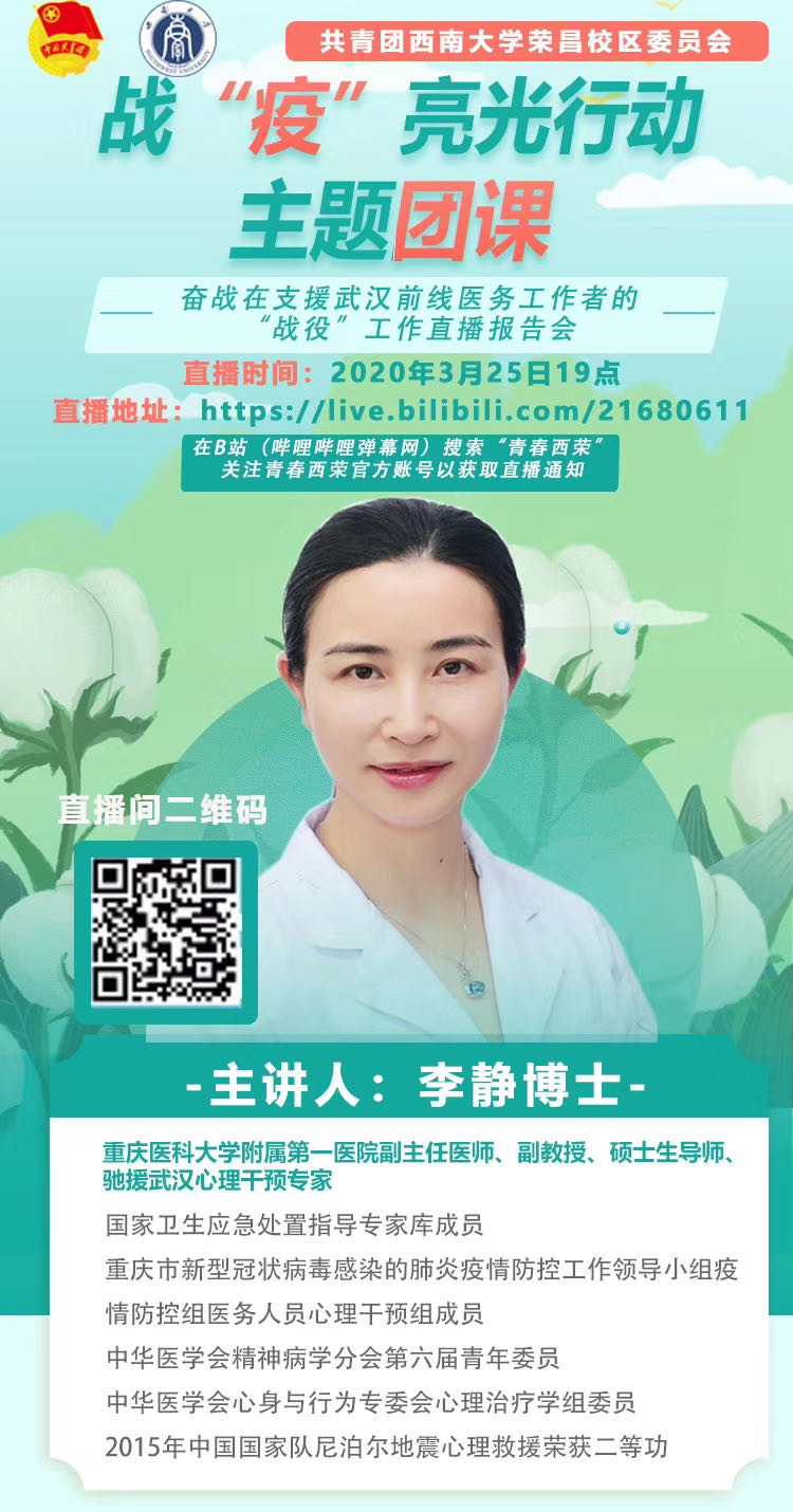当晚,一堂名为“战‘疫’亮光行动”主题团课---奋战在支援武汉前线医务工作者的“战役”工作直播报告会,在荣昌校区团委哔哩哔哩弹幕网官方账号“青春西荣”开启直播。直播间里,正在武汉抗击疫情前线的重庆医科大学附属第一医院李静博士为广大团员青年上了一堂生动的主题团课。李静博士是重庆医科大学附属第一医院精神科副主任医师、副教授、硕士生导师,作为国家卫生应急处置指导专家库成员、国家援鄂医疗队、重庆市援鄂医疗队成员,目前仍在武汉大学人民医院抗疫一线工作。直播开启前,李静刚刚结束一天紧张而繁忙的工作。
