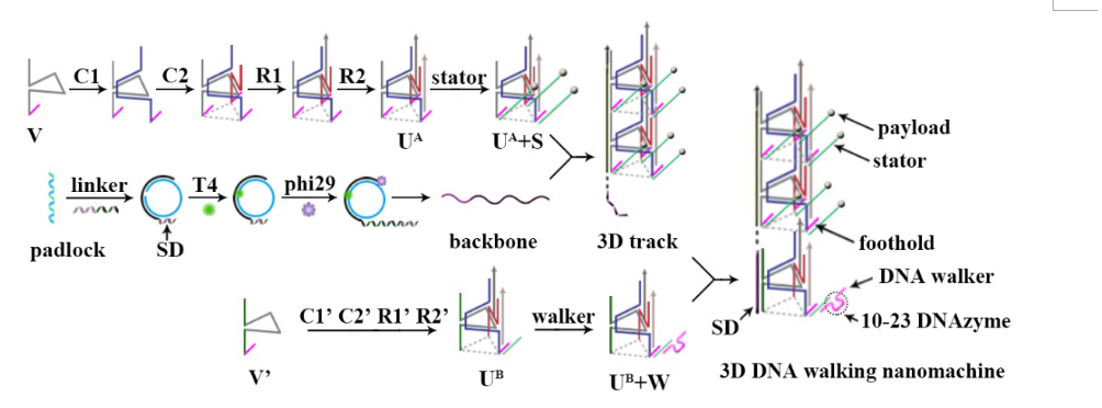 另一题为“A well-directional three-dimensional DNA walking nanomachine that runs in an orderly manner”的研究成果,设计了一个三维(3D) DNA纳米步行器,创新构建了一个功能化的3D DNA轨道,使得DNA步行器方向可控、有序的沿轨道行走执行检测或药物输送。