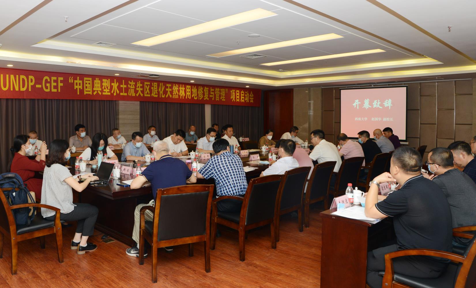 联合国开发署(UNDP)-全球环境基金(GEF)“中国典型水土流失区退化天然林用地修复与管理”项目启动会近日在学校桂圆宾馆召开。来自国家林业和草原局天保办、国际司、科技司的有关领导,以及UNDP驻华代表处和重庆、云南、贵州、甘肃和福建等5个项目省(市)天保办的有关领导参加会议。国家林业和草原局天保办一级巡视员文海忠、UNDP驻华代表处项目主任马超德、国家林业和草原局国际司副处长何金星和科技司处长冉东亚分别致辞。学校副校长赵国华到会祝贺,并致欢迎辞。会议由国家林业和草原局大兴安岭林业集团公司负责人主持。