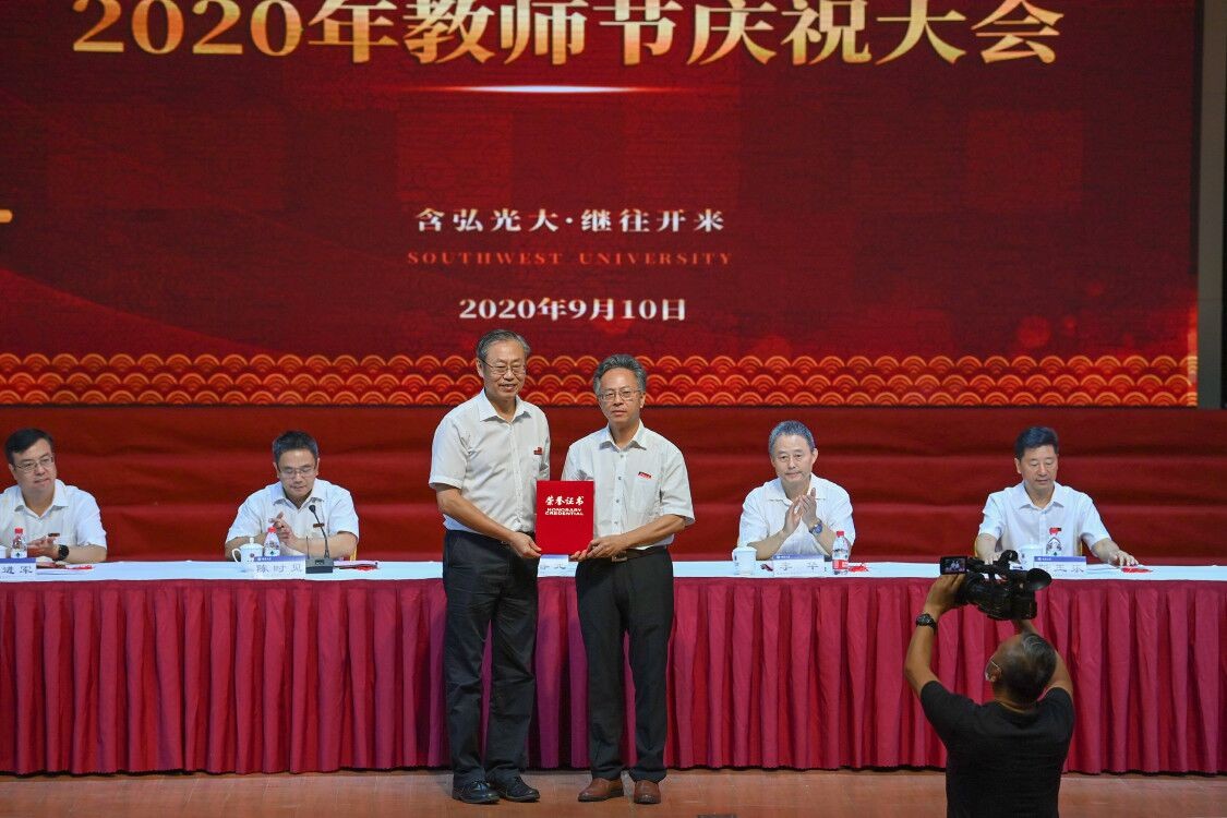 校领导、党委常委分别为2020年重庆市教书育人楷模、Beat365中文官方网站2018-2020学年度优秀教师和优秀教育工作者代表、从事教育工作30年教职工代表、荣休教师代表颁发证书和纪念章,为新进教师代表授校徽。