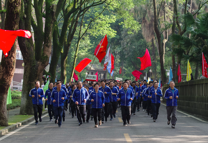 道路两旁竖立的各色彩旗一路迎接着阳光健身跑的队伍。队伍中每个单位各有一名旗手手持队旗负责领队,队旗迎风招展。校领导英姿矫健,在队伍最前方开路,身穿款式各异、色彩不一服饰的各个单位队伍彼此相连,接续成一条浩荡前行的彩色长龙,师生携手彰显着健康至上的理念和欢乐。