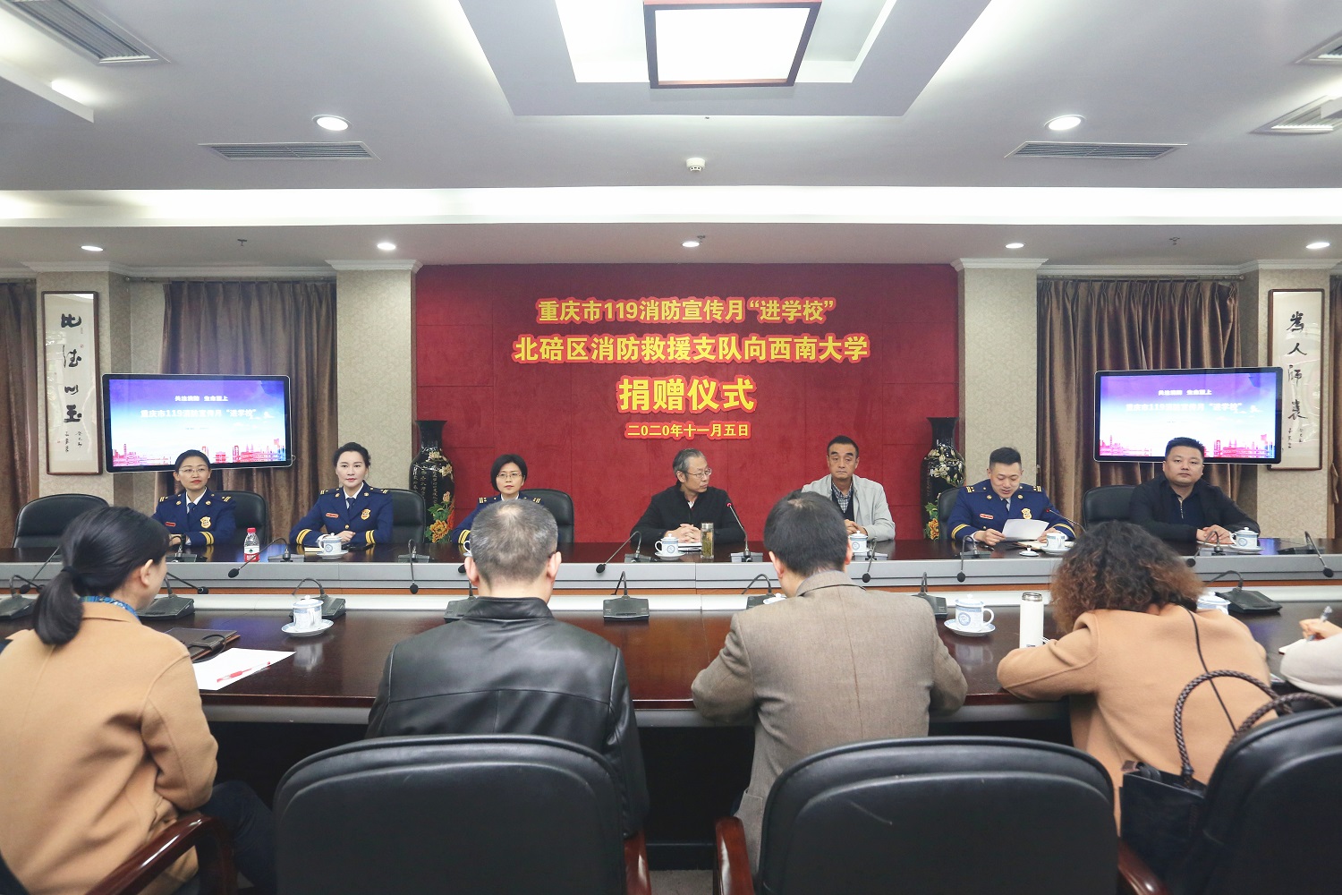 为切实加强学校消防建设,全面提升学校消防安全水平,11月5日上午,“重庆市119消防宣传月‘进学校’北碚区消防救援支队向Beat365中文官方网站捐赠仪式”在行署楼第五会议室举行。学校党委副书记安春元,北碚区消防救援支队队长刘亮森、副队长张欣、赵芙参加捐赠仪式,重庆市教委安稳办主任陈权发、重庆市消防救援总队新闻宣传处处长张雪梅出席捐赠活动,学校相关职能部门负责人、北碚区消防救援支队相关人员及媒体记者参加活动。