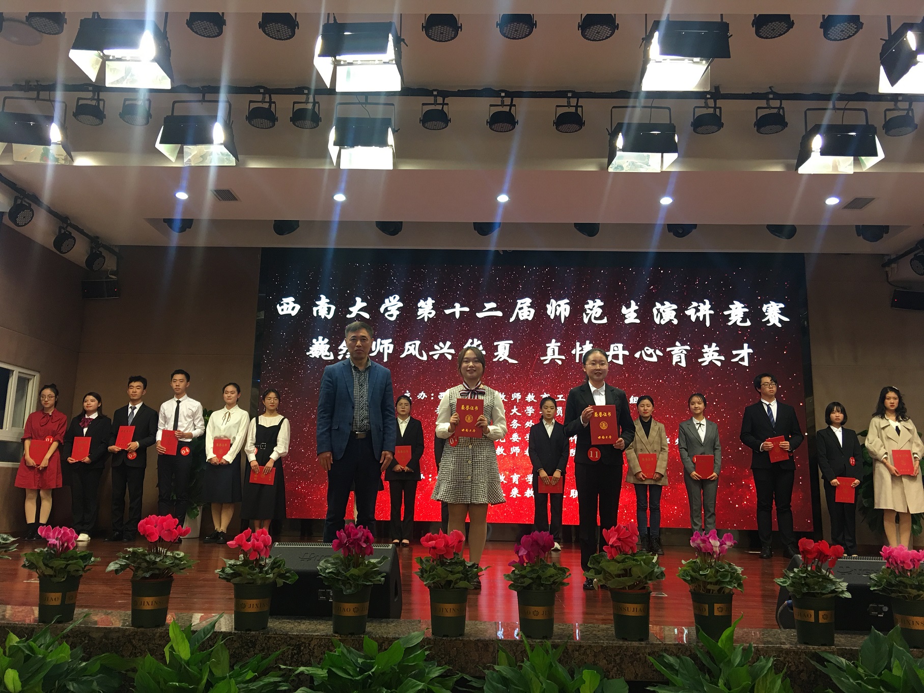 比赛结束,评委从主题、素材、结构、语言四个方面对参赛选手的表现进行了点评。最终,教育学部的王诗桐和生命科学学院的韦慧婷获得一等奖。地理科学学院的慈萌瑶等6名同学获得二等奖。外国语学院的蔡虹西等10名同学获得三等奖。潘洵及学校教师教育工作领导小组有关单位负责人为获奖选手颁奖。