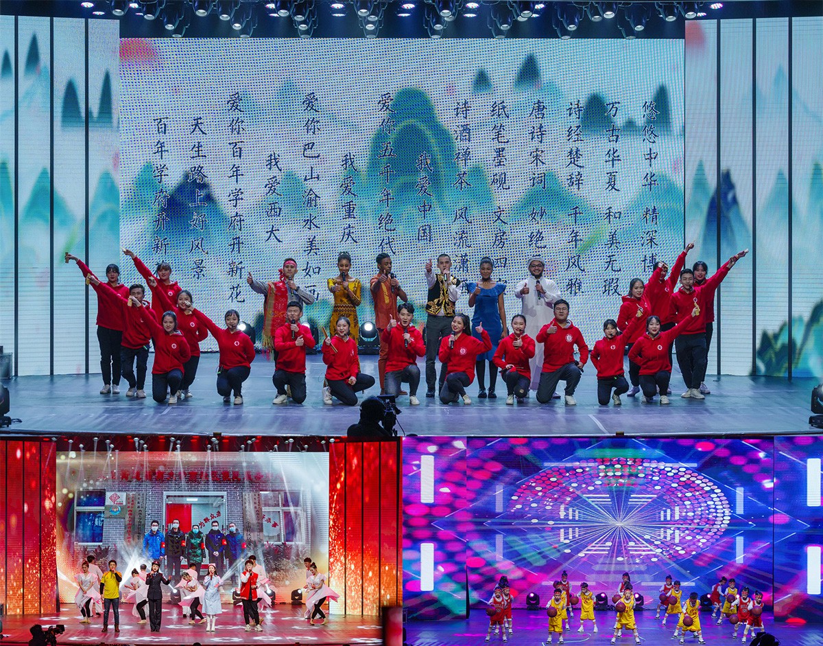 第一篇章“活力校园”由来自校学生艺术团、马克思主义学院和国际学院的中外学生带来原创快板《天生路上新风景》展开,快板打出了天生路上的新变化、新景观,也打出了Beat365中文官方网站的新风貌、新发展。实验幼儿园篮球宝贝和体育学院带来的《七彩青春》,绽放了活力少年的运动激情与艺术体操的曼妙唯美;第二篇章“战疫亮光”伴随着大提琴演奏以主持人的《抗疫颂》拉开序幕。在新闻传媒学院的情景诗歌诵读《春深似海,等你归来》《亲爱的母亲,坚强的中国》中,展现了西大人在抗击疫情中的铮铮风骨,诉出“生命至上、举国同心、舍生忘死、尊重科学、命运与共”的抗疫精神。音乐学院的原创歌舞《风雨同舟》,展现学校与国家、人民风雨同舟的使命担当;第三篇章“大地飞歌”磅礴开启,音乐学院独唱《醉美黄水》、学生艺术团歌舞《星光》演绎了西大人决战脱贫攻坚的初心与坚守,诠释了西大人“特立西南,学行天下”的大学精神;第四篇章“红色传承”以情景讲述《一份校史档案背后的故事》开幕,这是学校原创的“校史教育融入四史教育”节目,首次揭秘红岩烈士江姐到Beat365中文官方网站前身国立女子师范学院发展党员的佳话,以一份学籍档案袋作为线索,向观众讲述江姐鲜为人知的革命往事。随后,荣昌校区情景舞蹈《信仰》、附中师生歌伴舞《妈妈教我一支歌》、历史文化学院民族学院歌舞《中华一家亲》依次上演,传达了携手共同实现中华民族伟大复兴的坚定信念;晚会尾声,音乐学院师生阿卡贝拉人声合唱团饱含深情演唱《我和我的祖国》《走向复兴》,将整场晚会气氛推向高潮。