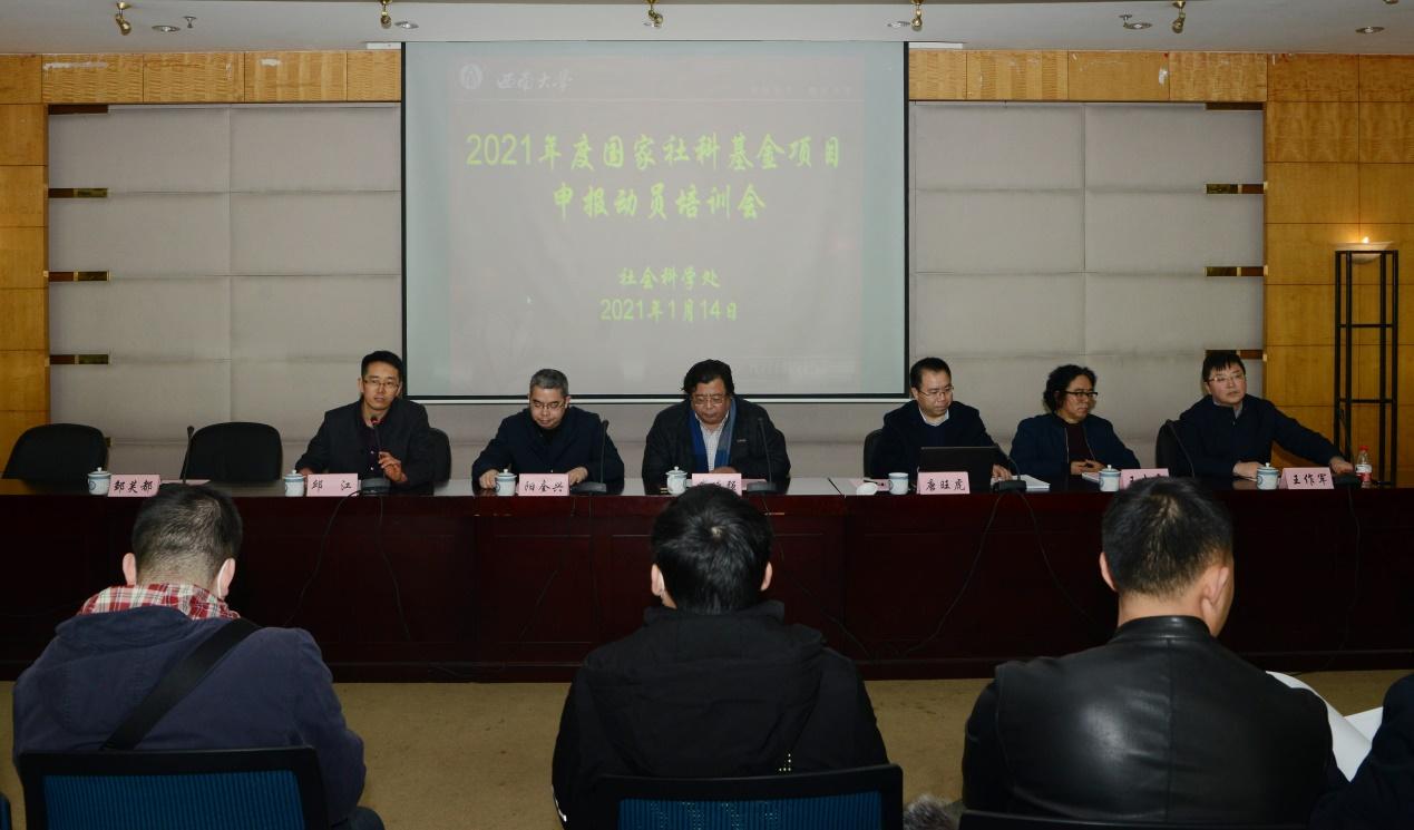 为抓好2021年度国家社科基金项目申报,严把项目质量关,提高项目命中率,学校于1月14日在田家炳教育书院八楼会议室举办“2021年度国家社科基金项目申报动员培训会”。副校长崔延强、重庆市社科联副主席阳奎兴、重庆市社科规划办主任唐旺虎、学校经济管理学院王志章教授、历史文化学院 民族学院邹芙都教授出席会议,学校从事人文社会科学研究的广大科研人员、拟申报2021年度人文社科基金项目的科研人员、文科单位主管科研的领导和科研秘书共300余人参会。会议由社会科学处主要负责人主持。