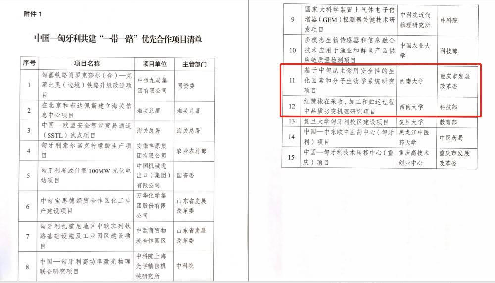 学校两个项目入选中匈共建“一带一路”优先合作项目清单是继学校“中匈食品科学合作研究中心”获得包括国家重点研发项目在内的中匈合作系列项目之后的又一新突破。“中匈食品科学合作研究中心”将以此为契机,深入贯彻落实习近平总书记关于高质量共建“一带一路”的系列重要讲话精神,积极推进中匈合作项目落地实施,推动中匈共建“一带一路”走深走实,助推重庆市积极融入“一带一路”建设的国家战略布局,助力学校建设和申请“一带一路”联合实验室。