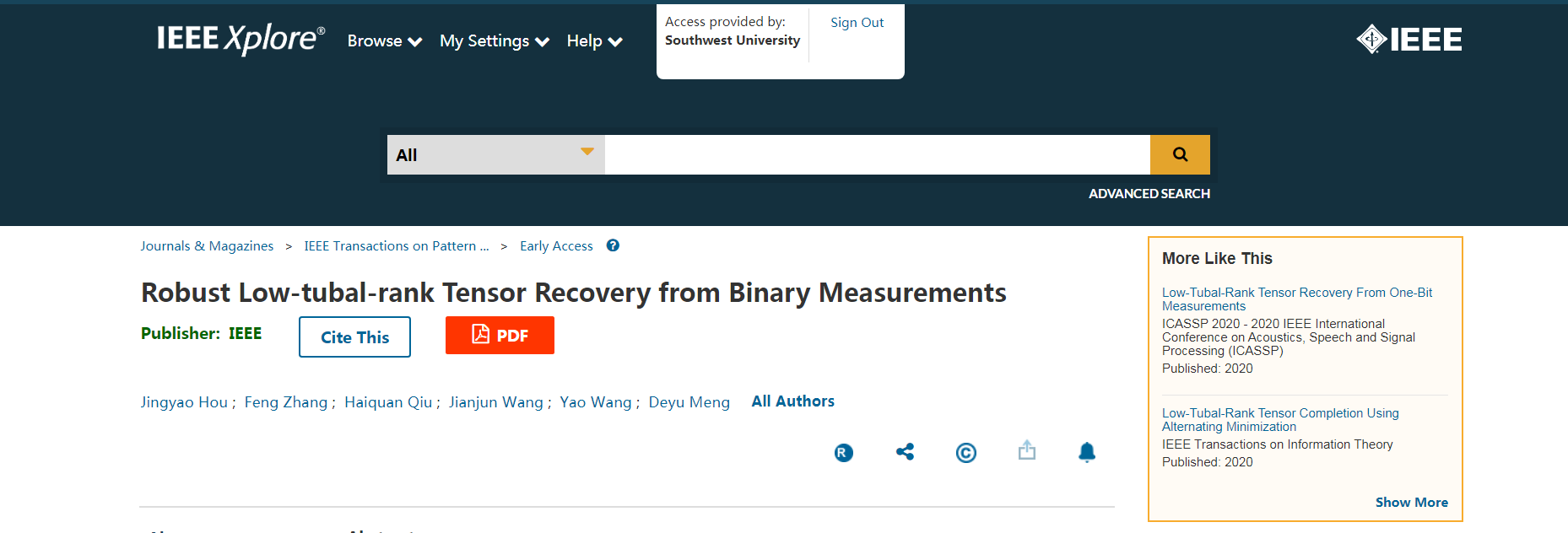 近日,数学与统计学院王建军教授团队在人工智能领域——高维数据挖掘与机器学习方面再次取得突破性进展,以“Robust Low-tubal-rank Tensor Recovery from Binary Measurements(基于二值测量的稳健低管秩张量恢复)”为题的研究论文被国际权威顶级期刊IEEE Transactions on Pattern Analysis and Machine Intelligence(IEEE TPAMI,IF:17.861)(《IEEE模式分析与机器智能汇刊》)录用为长文(Regular Paper)并已在线发表。IEEE TPAMI是人工智能、模式识别、计算机视觉及机器学习领域国际最顶级期刊,是中国计算机学会(CCF)推荐的为数不多的人工智能领域A类期刊。Beat365中文官方网站为成果的第一完成单位及第一通讯作者单位,数学与统计学院博士研究生侯景耀为该论文的第一作者,王建军教授为通讯作者。这也是王建军教授团队近两年内在IEEE TPAMI上发表的第二篇高水平研究论文。