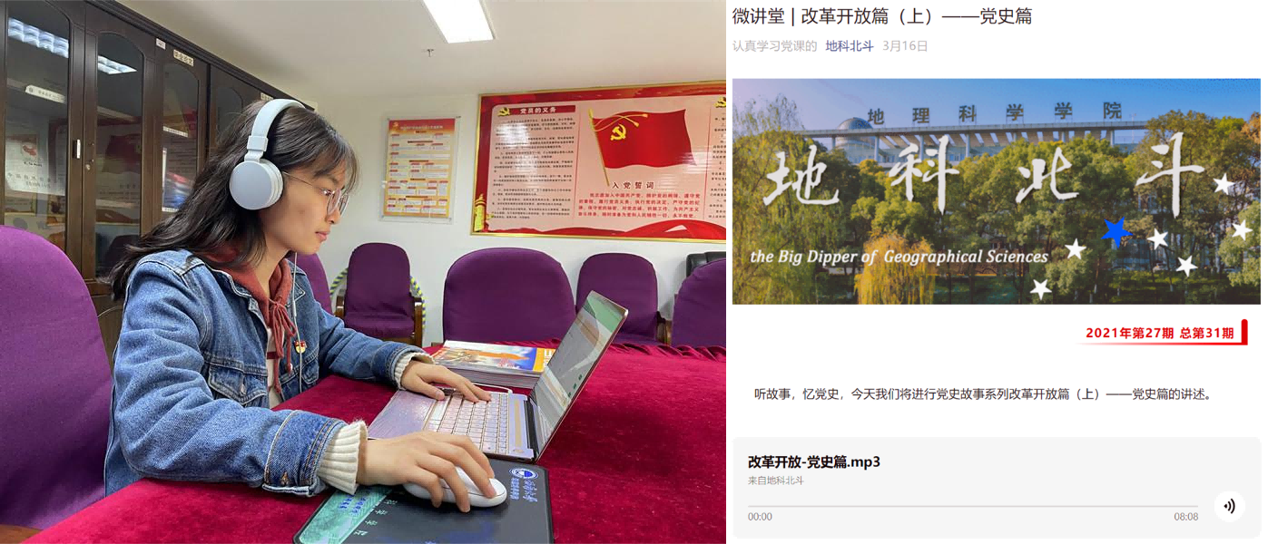 党史故事包含七个篇章,以党的发展历程中的重大事件为线索,以不同时期的历史任务、辉煌成就和鲜活人物故事为主干,以音频讲述的方式,在学院融媒体中心技术指导下,通过“地科北斗”党建微信公众平台进行“声音+文字”的专题推送,回顾建党百年的宏伟历程。故事主题鲜明,特色突出,集中展示革命先辈全心全意为人民服务的感人事迹,突出展现中国共产党人的先锋模范作用。
