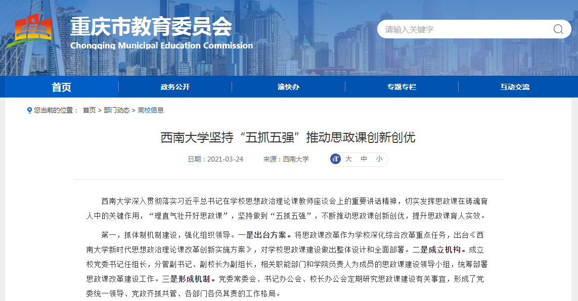 近日,重庆市教育委员会官网报道学校坚持“五抓五强”推动思政课创新创优,原文如下。