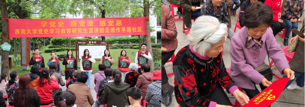 4月11日,党史学习教育研究生宣讲团走进重庆市北碚区北温泉街道作孚路社区,通过讲述党史故事、歌唱革命歌曲、现场绣制党徽、举办知识竞答等方式,丰富社区居民周末文化生活,推进党史学习教育进万家。