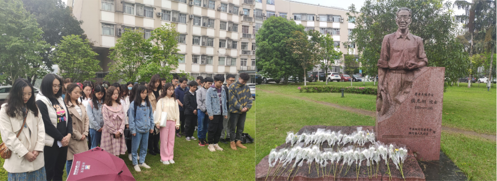 清明时节雨纷纷,师生们站在侯光炯院士雕像前,全体肃立默哀,认真仔细地将雕像擦拭干净。师生们缓步绕行侯光炯院士雕塑一周,满怀崇敬瞻仰雕塑,献上一朵朵寄托哀思的白菊。