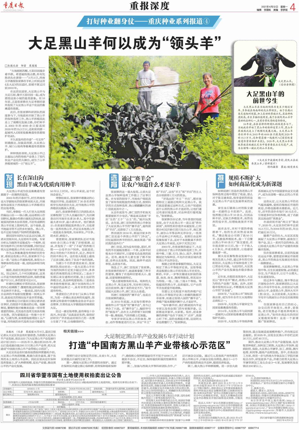 学校动物科学技术学院张家骅教授领衔的大足黑山羊课题组2003年发现大足黑山羊资源群体。经与大足区政府深度合作,课题组连续18年开展种质特性研究、保种选育、良种繁育体系建设、推广应用等,使大足黑山羊成为国家畜禽遗传资源,并列入《国家级畜禽遗传资源保护名录》。“大足黑山羊遗传资源保护与利用”获重庆市人民政府科技进步一等奖。2020年大足黑山羊传统养殖系统被认定为中国重要农业文化遗产。同年,重庆市草食牲畜产业技术体系设立渝西综合试验站,大足黑山羊产业发展走上了快车道。