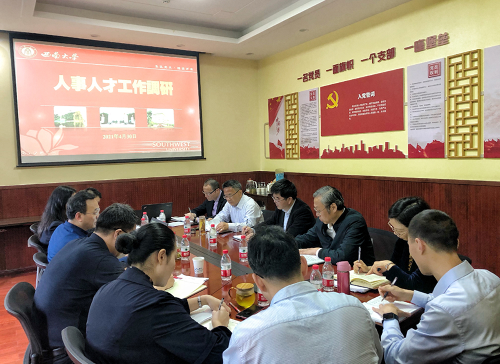 4月30日上午,学校党委书记李旭锋率队到人力资源部 党委教师工作部开展人事人才工作专题调研,党委副书记安春元,副校长陈时见,党委常委、党委组织部部长杨爱华,以及学校相关部门负责人参加调研。人力资源部 党委教师工作部全体科级以上干部参会。