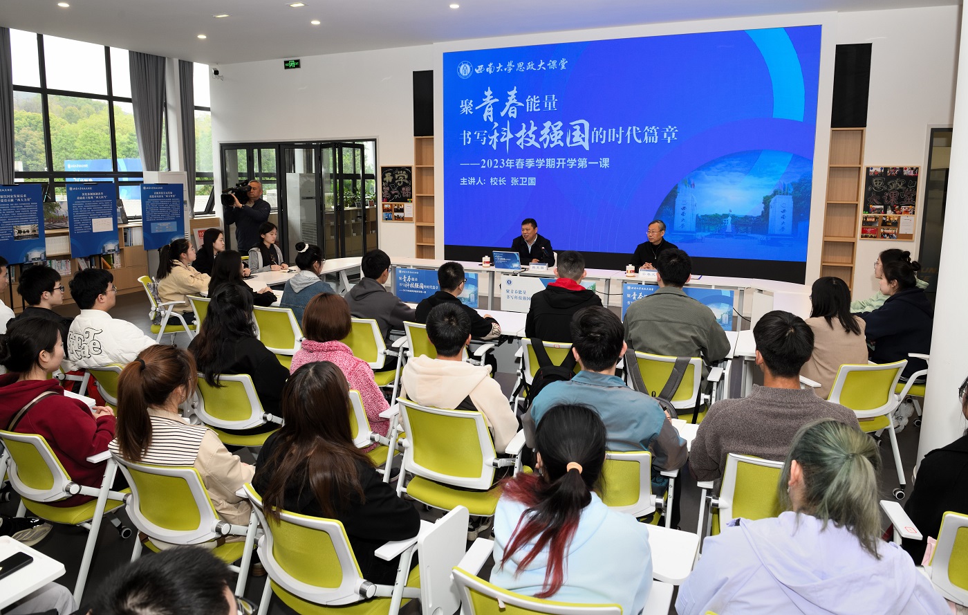 3月28日下午,学校校长张卫国以“聚青春能量 书写科技强国的时代篇章”为题,从“面向中国式现代化、面向世界、面向未来,以全球视野谋定科技发展的中国方案”“系统谋划、一体推进、以身作则,以奋进之笔回答教育何为的时代课题”“锤炼意志、牢记使命、追求卓越,以崇高的历史责任感和使命感贡献强国有我的青春能量”三个方面,为全体同学讲授大思政课。学校党委副书记安春元主持学习活动。