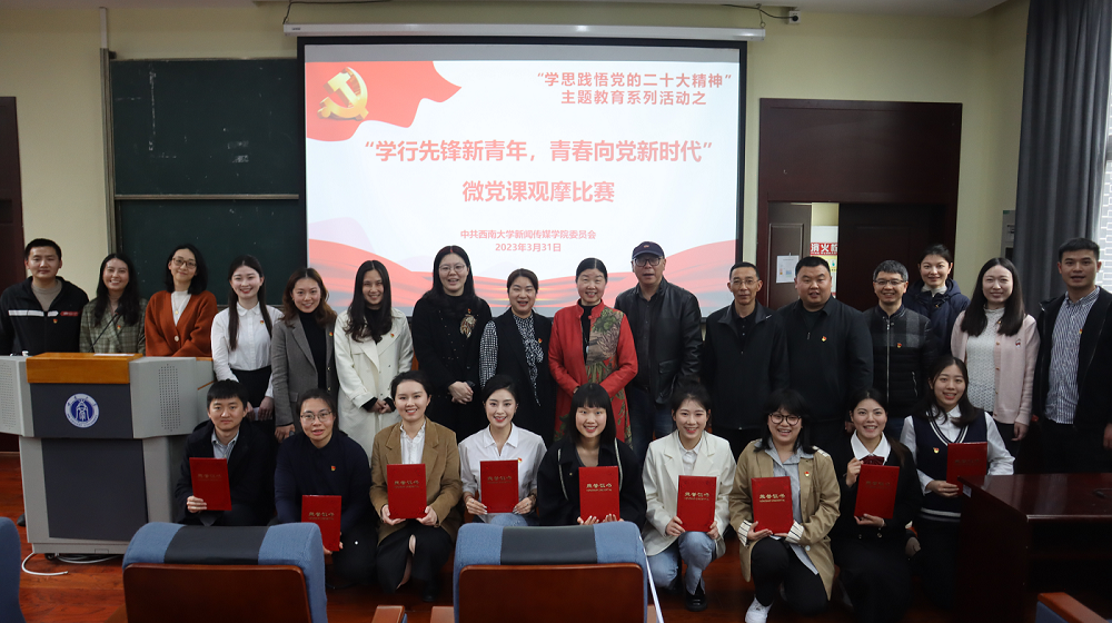 学行先锋新青年,青春向党新时代。3月31日下午,为持续推动党的二十大精神学习教育走深走实、入脑入心,充分发挥党员在学习宣传贯彻党的二十大精神上的示范引领作用,以讲促学,以学促行,新闻传媒学院党委举办“学思践悟党的二十大精神”系列主题教育之微党课现场观摩比赛。学校党委宣传部有关负责同志,学院两委委员、党支部书记、全体在校师生党员共计一百余人参加本次活动。