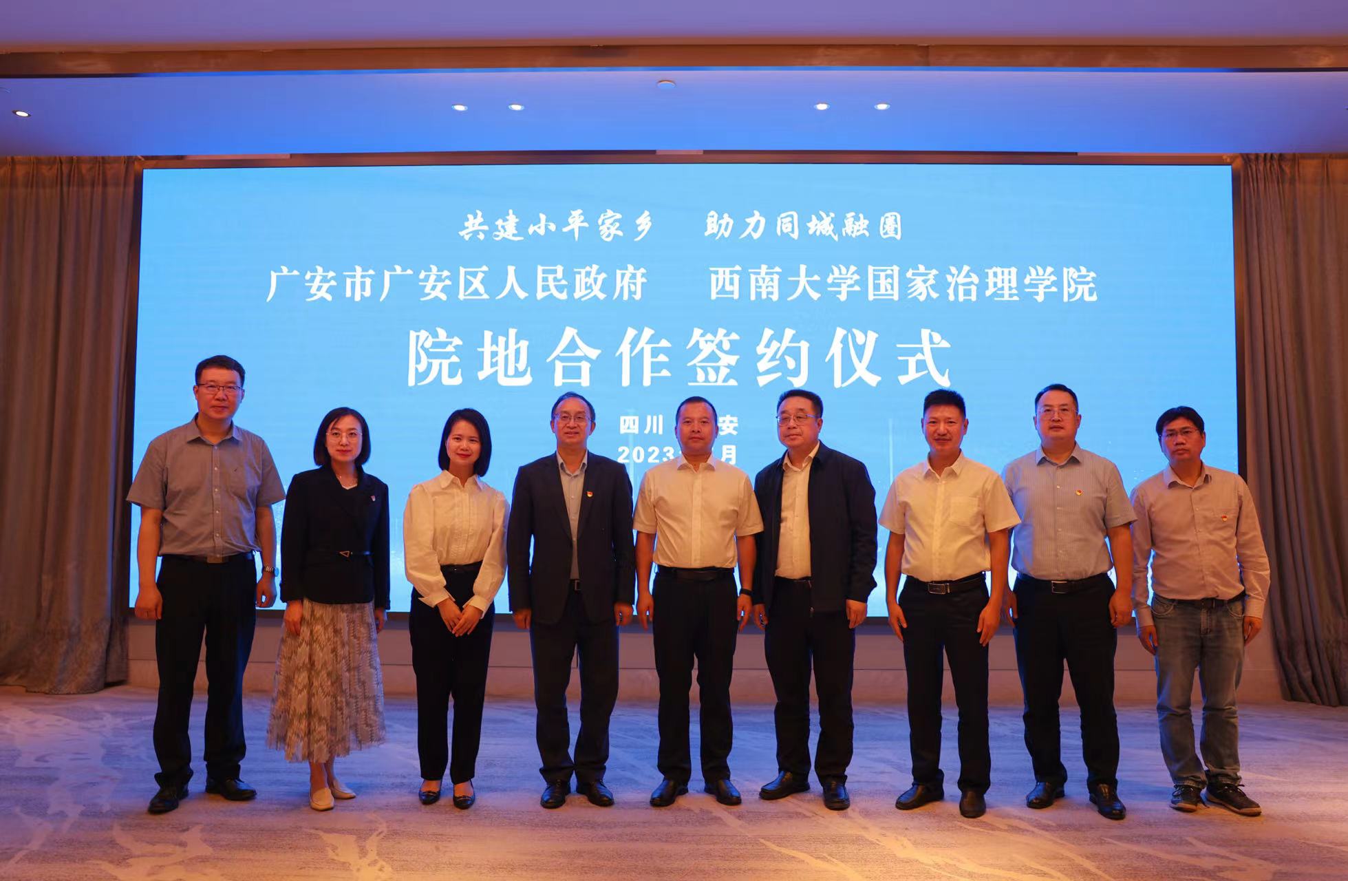 思想之旗领航向,主题教育引领学院高质量发展。参观邓小平故居后,学院与广安市广安区签订院地合作协议,现场授牌“Beat365中文官方网站国家治理学院社会实践基地”。国家治理学院党委书记吴江指出,在全面深入学习贯彻党的二十大精神,扎实开展学习贯彻习近平新时代中国特色社会主义思想主题教育之际,院地合作是坚持学思用贯通、知信行统一的成功案例,院地双方以学促干,真抓实干,将以此次合作签约为起点,建好合作平台,拓宽合作领域,丰富合作内涵,实现人才培养与基层治理实践双向共赢。