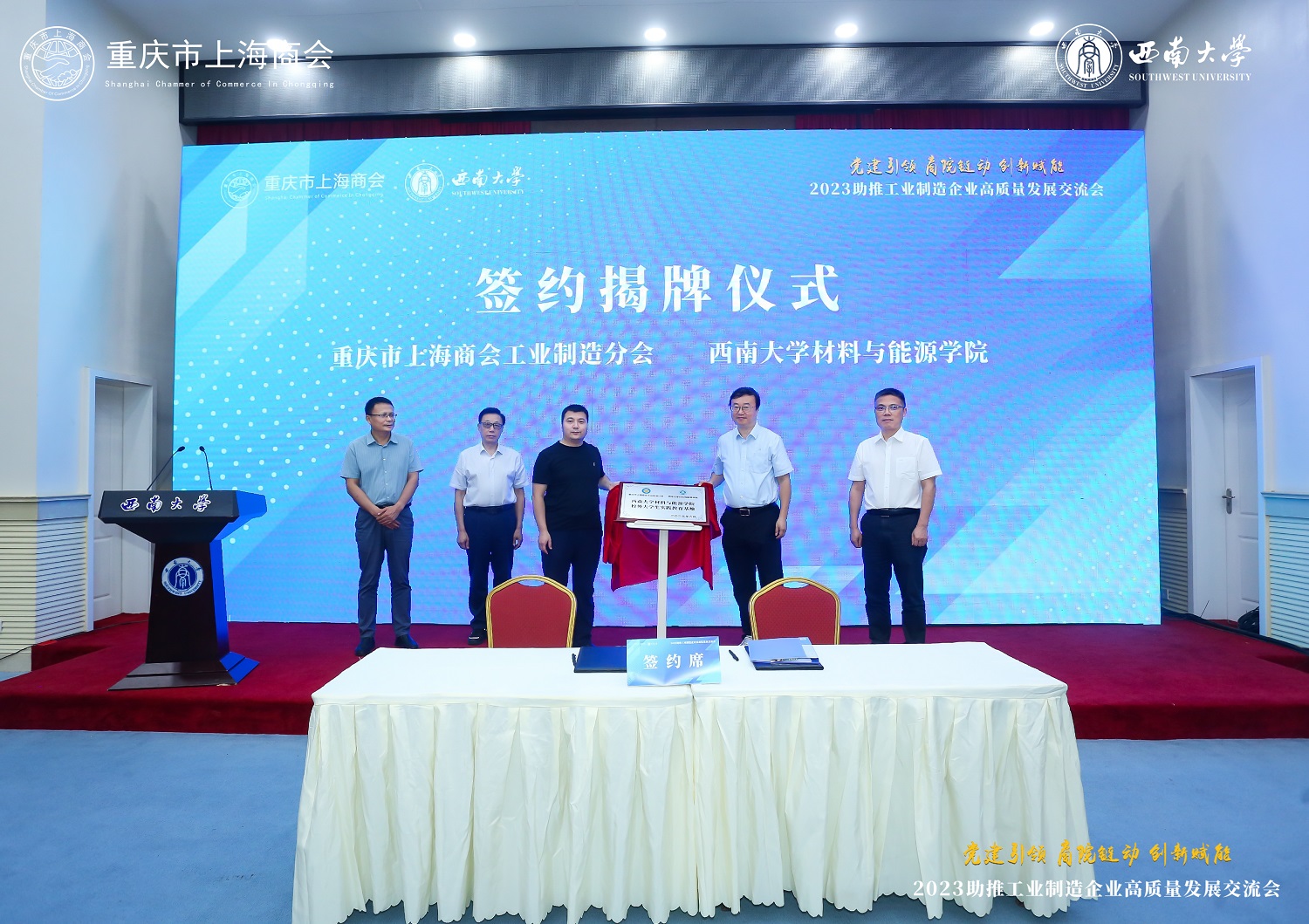 为推动学习贯彻习近平新时代中国特色社会主义思想主题教育走深走实,谋划院商企深度合作,推进人才协同培养和科技成果转化,推动工业制造企业高质量发展,6月29日下午,材料与能源学院和重庆市上海商会共同举办以“党建引领 商院链动 创新赋能”为主题的2023助推工业制造企业高质量发展交流会,并签署合作协议。学院党委书记梁武、院长徐茂文,重庆市上海商会执行会长沈仁刚、副秘书长姚庆伟、工业制造分会会长陈涛,学院专家教授及重庆市上海商会近90名企业家参加活动。