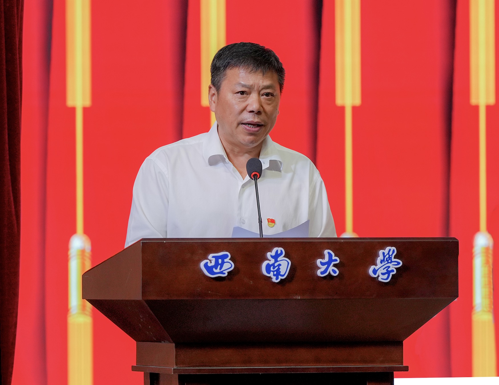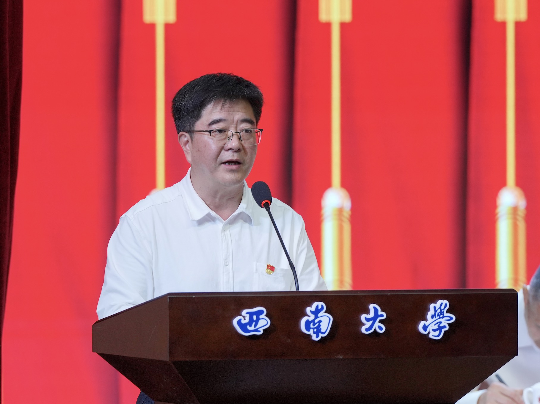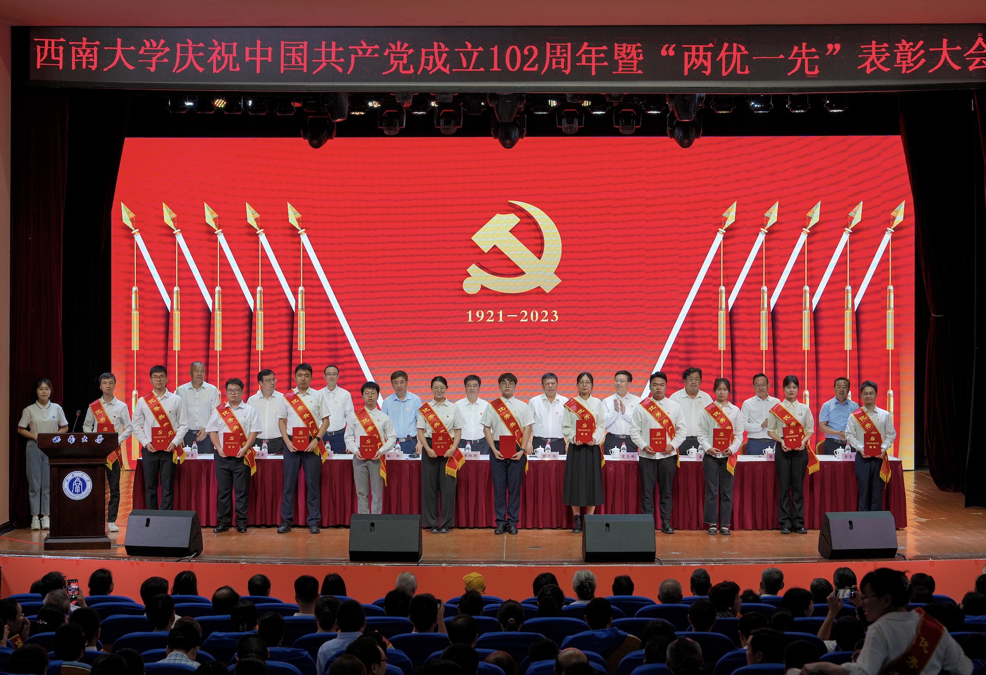 6月30日,学校召开庆祝中国共产党成立102周年暨“两优一先”表彰大会,全体在校校领导、党委常委,受表彰的优秀共产党员、优秀党务工作者和先进基层党组织,副处级以上领导干部,2023年度“光荣在党50年”纪念章获得者代表,市级以上党建“双创”单位代表,党支部书记、专职组织员及党员代表参加大会。大会由党委副书记潘洵主持。