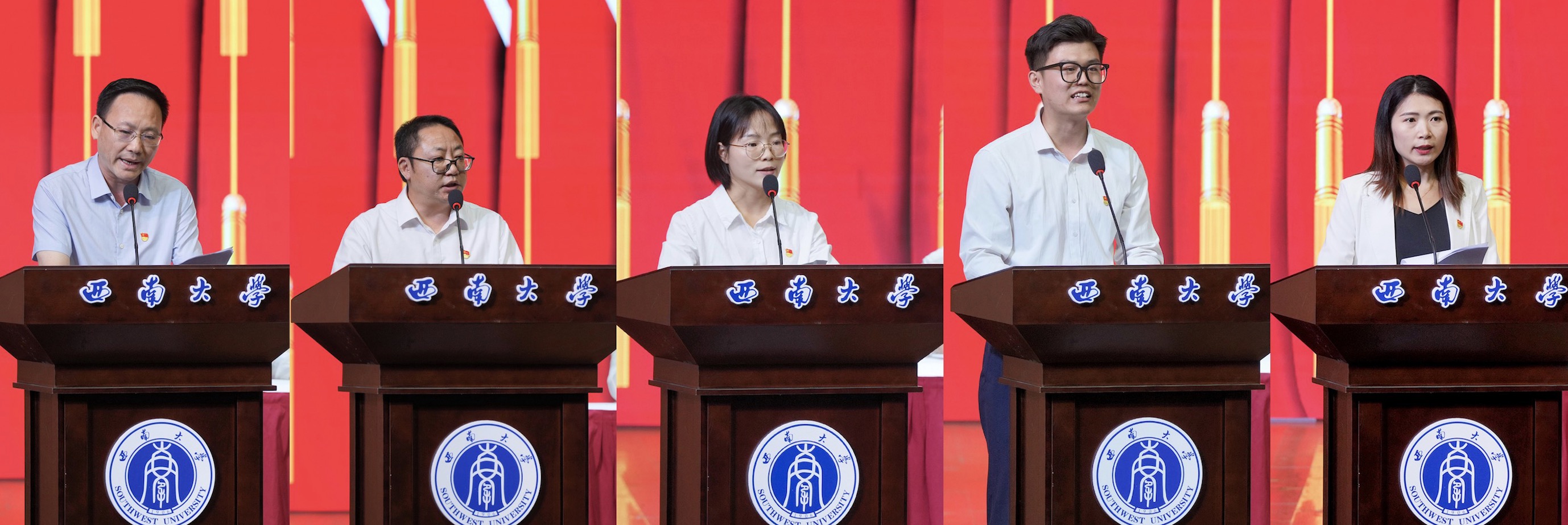 表彰大会在雄壮嘹亮的国歌声中拉开帷幕。校长、党委副书记张卫国同志宣读表彰文件,通报市级以上党建“双创”建设单位验收通过名单和重庆市教育系统“两优一先”表彰名单。文学院党委孙红举等149名共产党员、经济管理学院党委卢跃进等38名党务工作者、教育学部党委等8个二级党组织、外国语学院外国语言学及应用语言学硕士生党支部等58个党支部分别荣获“优秀共产党员”“优秀党务工作者”“先进基层党组织”“先进党支部”荣誉。