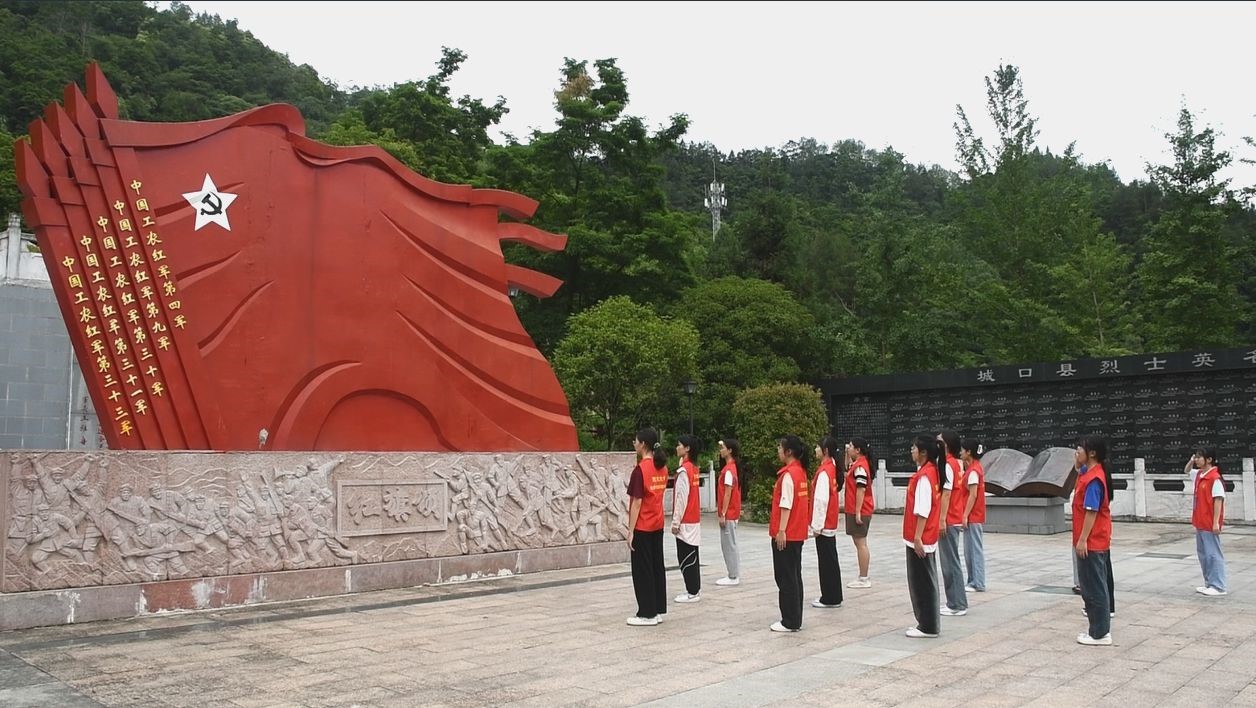 6月29日,实践团寻访革命文化,追溯红色记忆,前往川陕苏区城口纪念馆和城口县红军纪念公园,悼念革命先烈、瞻仰英雄烈士。在城口县红军纪念公园,同学们沿着曲折的楼梯拾级而上,在“红旗颂”雕塑前庄严宣誓,承诺将继承先辈遗志,共圆中国梦。同学们齐声同唱《我和我的祖国》,用歌声告白祖国,共颂爱国热情。