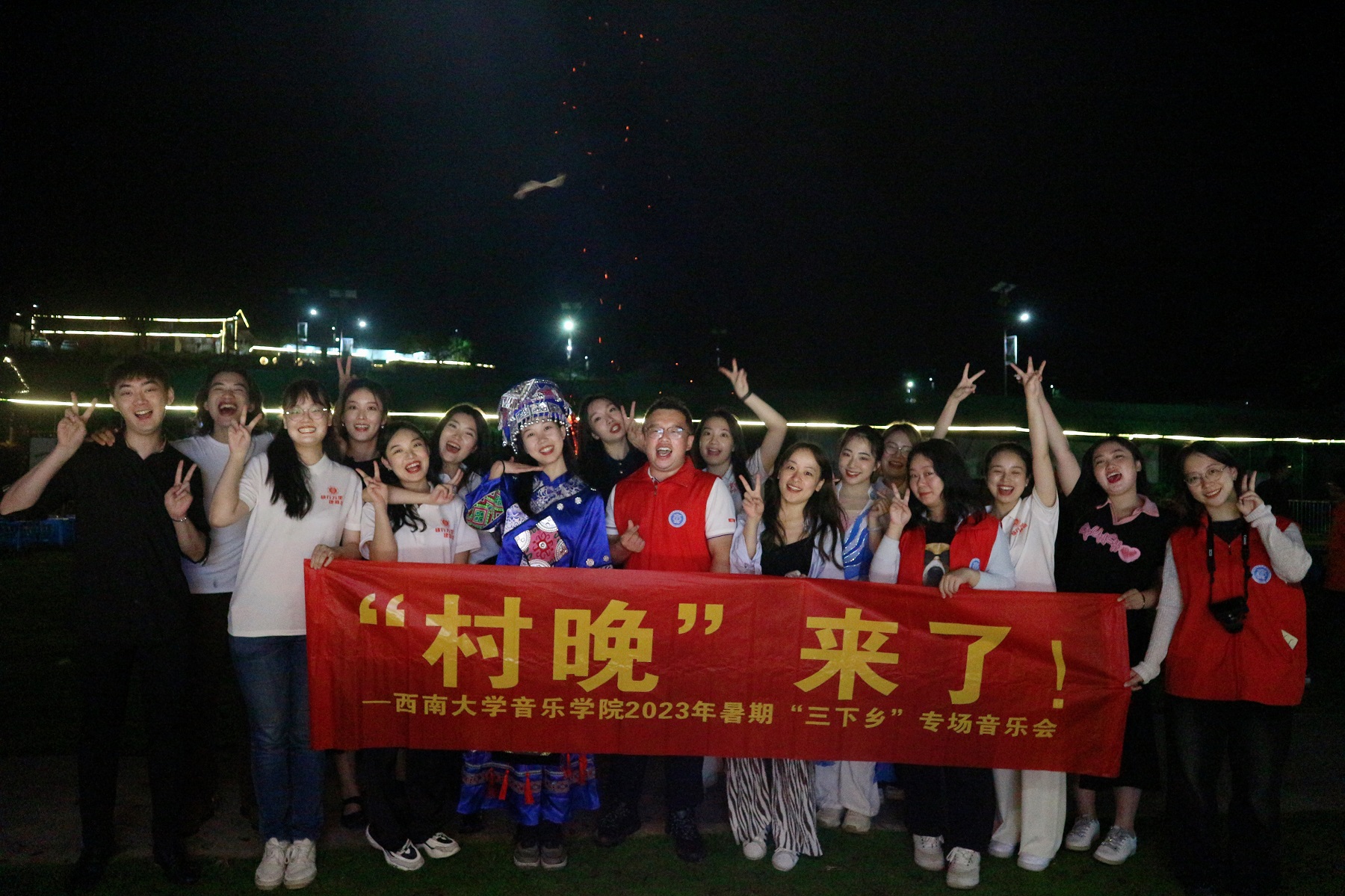4日晚,实践队盛装出席,为石柱中益乡村民们带来了一场独具特色的夏日“村晚”。石柱传统啰儿调《太阳出来喜洋洋》、歌舞朗诵《山村的夜晚》、器乐合奏、流行演唱等节目精彩不断,好戏连连。最后一曲《灯火里的中国》唱响民音,唱出乡情,活动在盛大的篝火仪式和传统土家族摆手舞中落幕。一次小小的“村晚”架起民族团结的桥梁,播下音乐的种子,接续文化的传承。演出环节掌声四起,村民们既是为动人的乐曲鼓掌,也是为这群“肯吃苦有才干”的音院青年学子们点赞。