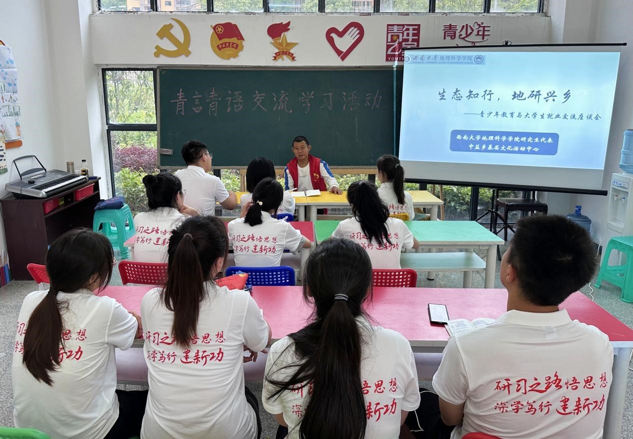 7月4日,实践队来到中益乡盐井村党委中心,为乡村留守儿童开展地理科普类知识讲堂,并送上地理科学学院特色周边。下午,实践队与青少年之家工作人员谭非同志开展了以“青少年教育”与“大学生就业”为主题的座谈会。队员们表示:新时代的青年更应当勤学笃行,在脱贫攻坚、乡村振兴、生态文明建设等基层绽放芳华。