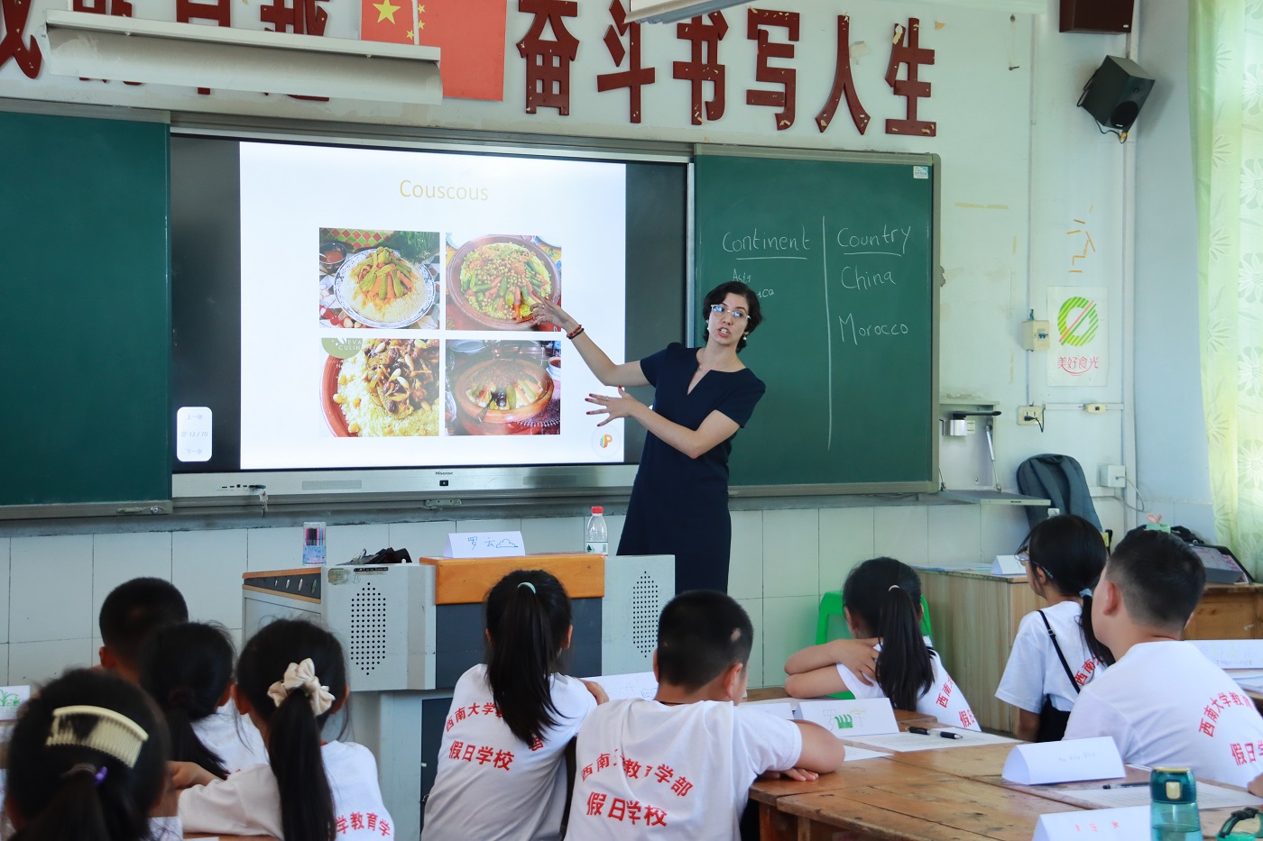 STEAM系列科学课程包括“国际视野”“拼识国土”“飞向蓝天”三类,旨在帮助学生打开国际视野、树立领土完整观、提高操作实践力。在“国际视野”课程中,实践团特别邀请了学部国际处留学生担任授课教师,为宁江小学的学生们传递“世界”的声音。“大家好,我的中文名字是……”,在简单的自我介绍后,借助文字和图片,留学生介绍了自己国家的历史、地理环境、社会文化等内容,“摩洛哥的中部和北部为峻峭的阿特拉斯山脉,东部和南部是上高原和前撒哈拉高原……”,在介绍自己国家的同时,留学生们设计你问我答,数字碰碰车等小游戏,激发学生学习兴趣,使学生专注于课堂。