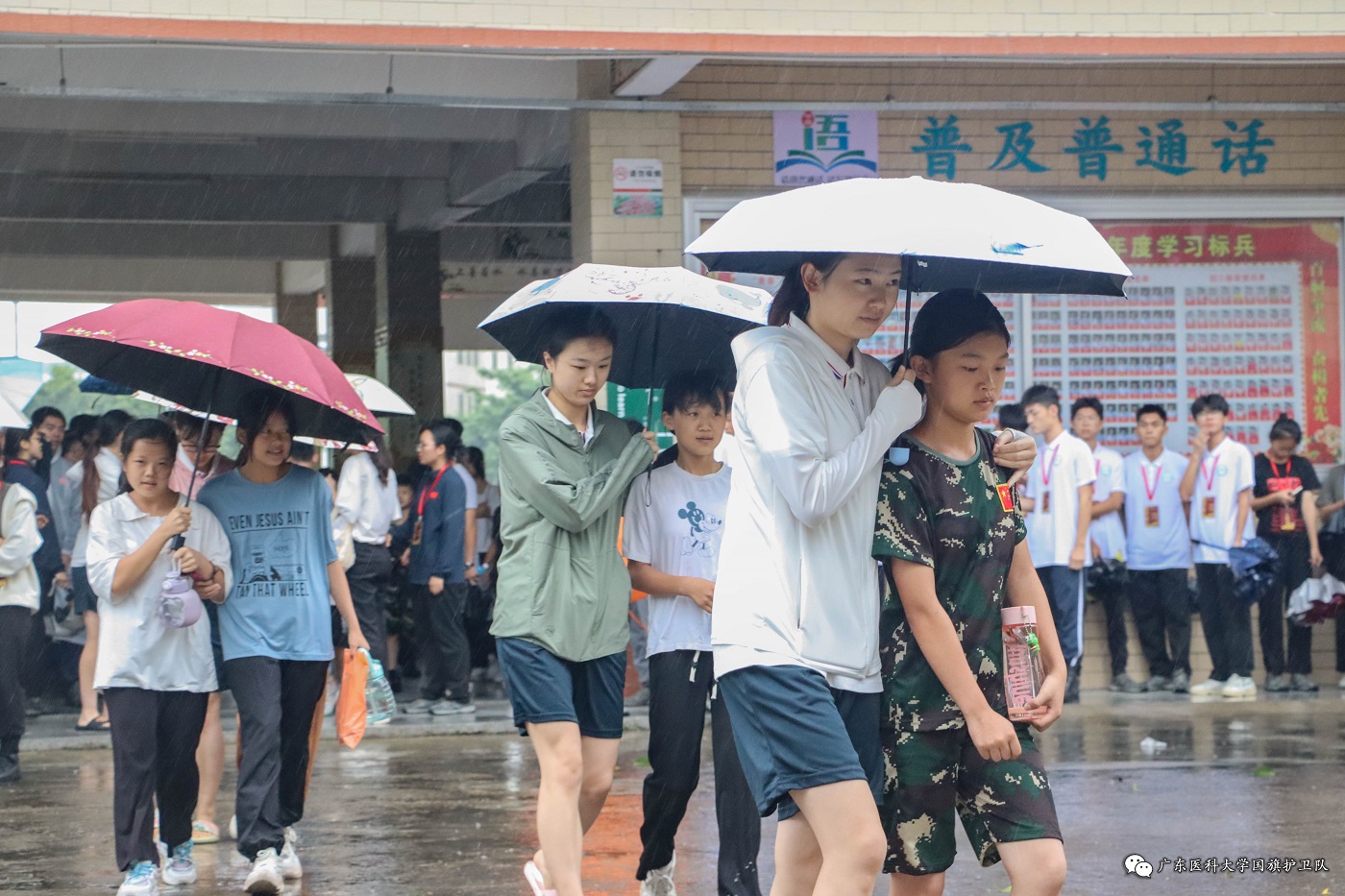 “工作很紧张,但寝室楼下黄澄澄的姜汤,孩子们明媚的笑脸,团结互助的氛围,都足以抵挡屋外的狂风骤雨。”学生女子国旗班的来自文学院的学生翁藜溪谈到:“这是一次别样的志愿体验,也让我们更加深刻的理解了风雨之后才能见彩虹。奉献的青春最美丽,我们一起期待风暴之后的湛蓝天空。”