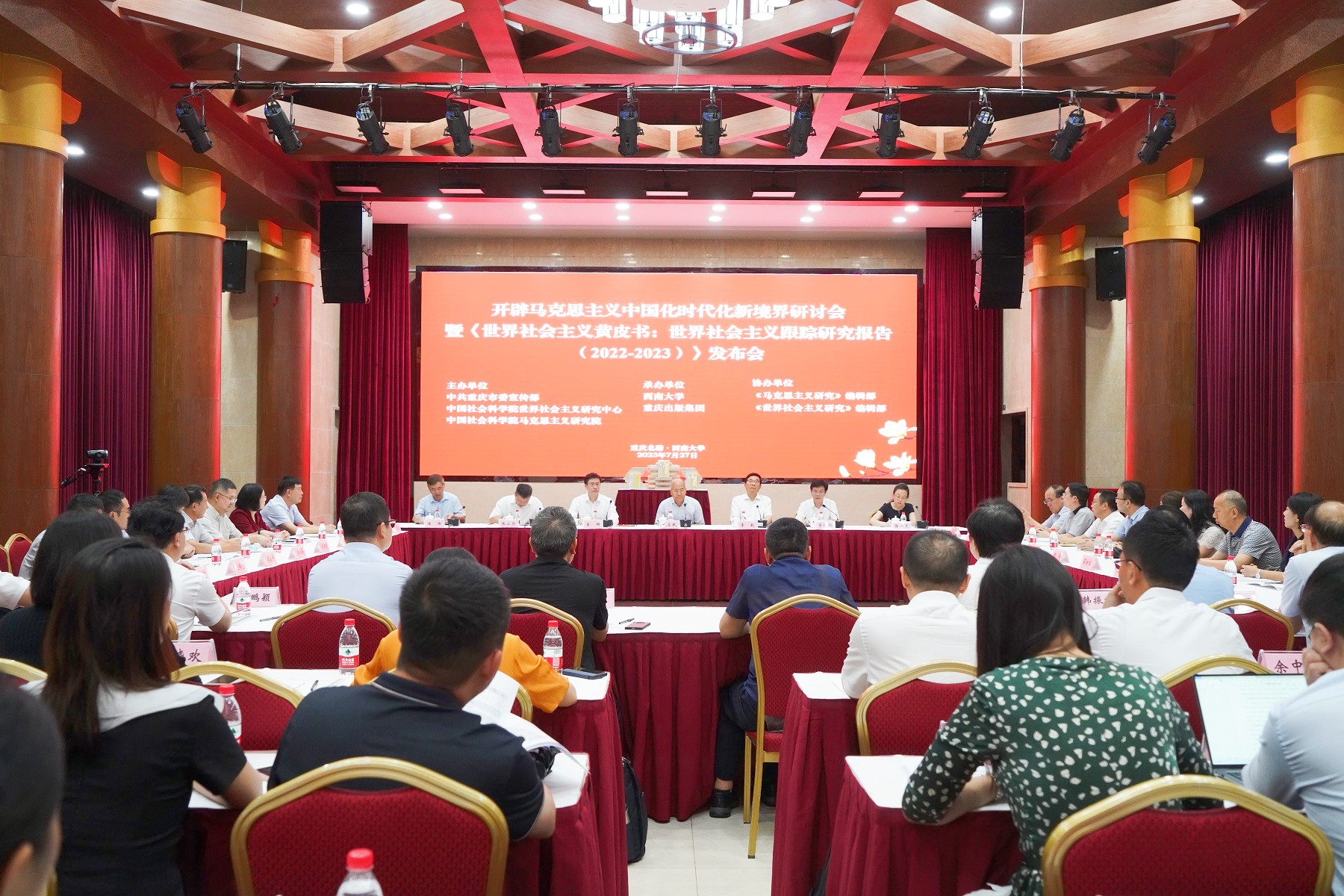 7月27日,“开辟马克思主义中国化时代化新境界”研讨会暨《世界社会主义跟踪研究报告(2022—2023)》发布会在学校召开。重庆市委常委、宣传部部长姜辉出席会议。Beat365中文官方网站校长张卫国致欢迎辞,中国社会科学院副院长甄占民、中共中央党校副校长李毅分别现场致辞,中国社会科学院原院长王伟光视频致辞,中国社会科学院原副院长、世界社会主义研究中心主任李慎明作会议主旨报告。