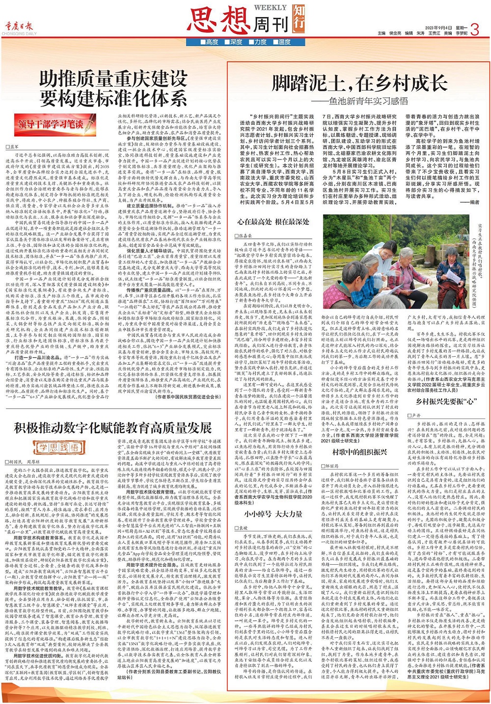 随着新学期的开启,学校学子乡村振兴实践成果登上了《重庆日报·思想周刊》,这位同学正是学校乡村振兴战略研究院组织的“乡村振兴田间行”之“乡村振兴实习生”主题实践活动参与者。在田间时光里,“乡村振兴实习生”们脚踏泥土向乡村学习、向农民学习,与村庄共同成长。《重庆日报》新媒体还专门开设“脚踏泥土,在乡村成长”专栏,刊发这批实习生们撰写的系列文章。他们用青春的笔触描绘了五彩斑斓的乡村工作,以及他们对乡村发展的所感所悟。