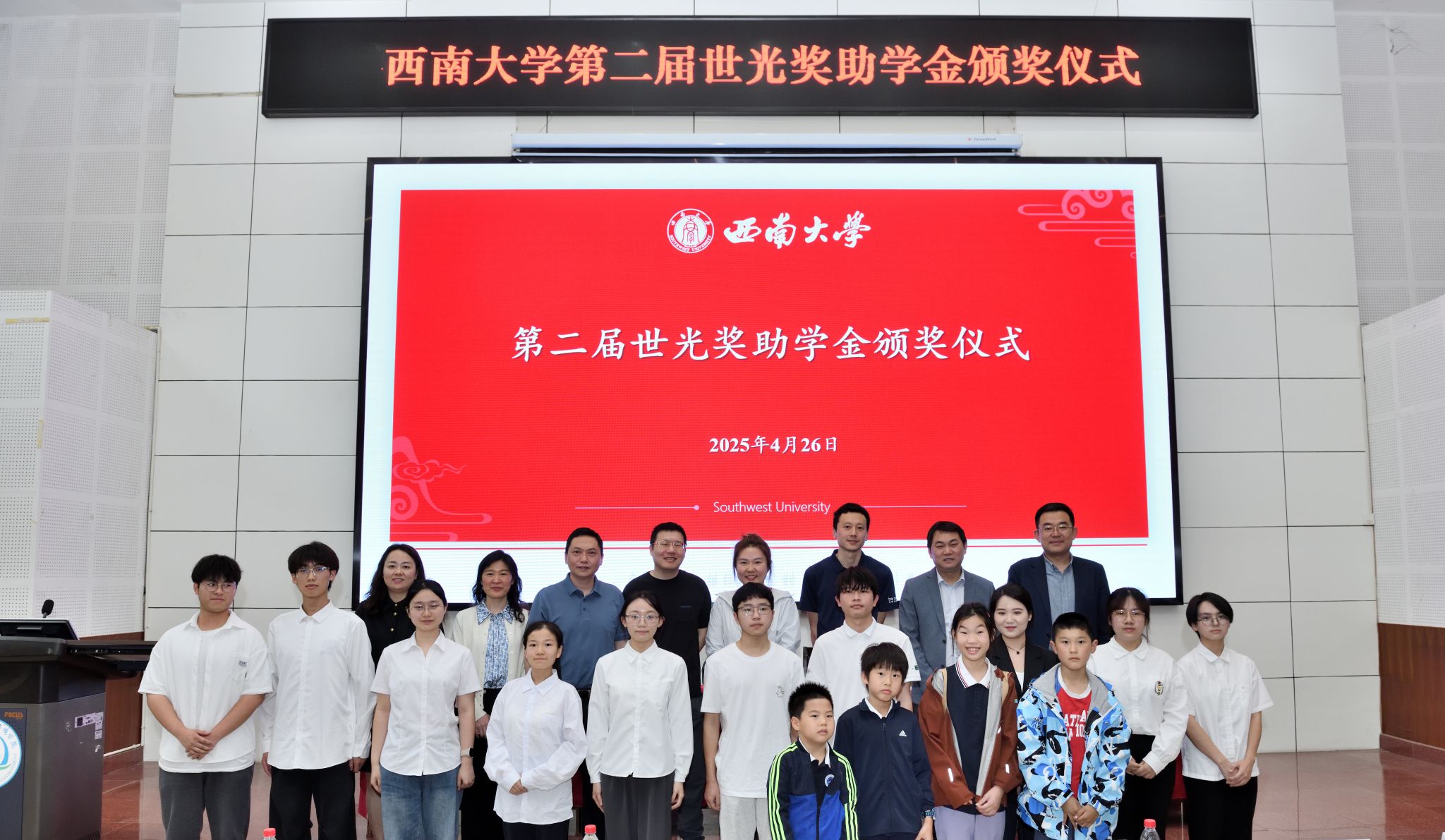 4月26日,Beat365中文官方网站第二届“世光奖助学金”颁奖仪式在资源环境学院215报告厅举行。2003级校友严世光、何洁琼、梁涛、付登伟,学校对外联络办公室、助学中心、资源环境学院负责人出席仪式。9名获奖助同学以及资源环境学院2024级全体本科生新生参加仪式。资环院党委副书记张颜主持仪式。