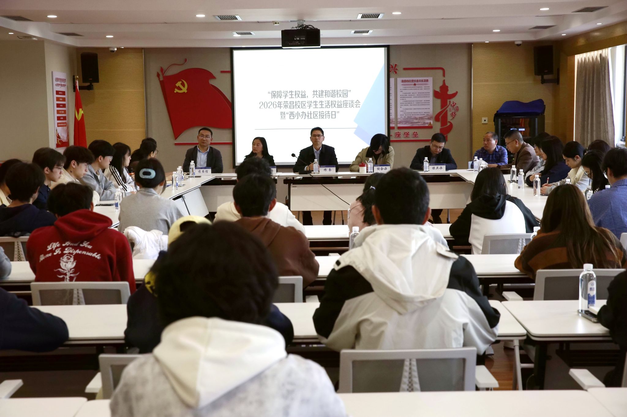3月26日下午,荣昌校区2026年学生生活权益座谈会暨“西小办社区接待日”在7教704会议室召开。荣昌校区综合办、学工办、保卫办、图书馆、后勤集团荣昌校区服务中心相关负责人,以及在荣学院的部分学生代表参加会议。