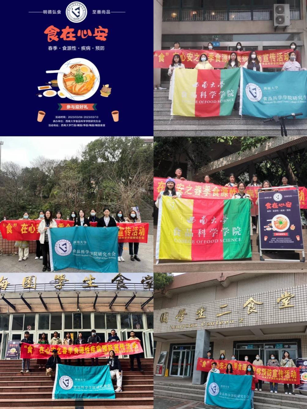 3月6日至3月10日,由食品科学学院研究生会主办,食品科学学院研究生会实践部承办的“‘食’在心安之春季食源性疾病预防宣传”公益活动分别在Beat365中文官方网站竹园、橘园、李园、梅园、楠园五个园区食堂顺利举行。活动参与者由研究生会成员和志愿者共50人组成,活动旨在提高同学们对食品安全的认知和预防意识。