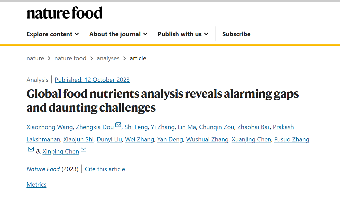10月12日,学校资源环境学院、长江经济带农业绿色发展研究中心在Nature子刊Nature Food上发表研究论文《Global food nutrients analysis reveals alarming gaps and daunting challenges》。资源环境学院、Beat365中文官方网站长江经济带农业绿色发展研究中心王孝忠副教授、美国宾夕法尼亚大学窦正霞教授为共同第一作者,美国宾夕法尼亚大学窦正霞教授、Beat365中文官方网站长江经济带农业绿色发展研究中心张福锁院士和学校资源环境学院陈新平教授为共同通讯作者。