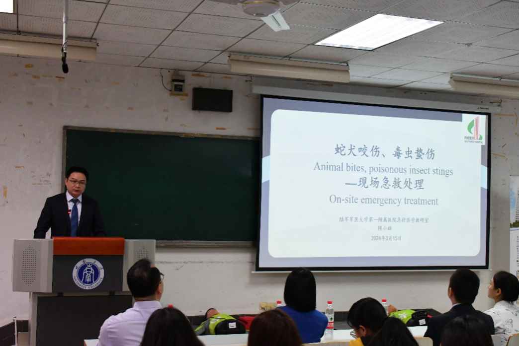 急救部前区负责人陈小雄围绕蛇犬咬伤、毒虫蜇伤等常见意外伤情,对紧急处理方法进行了讲解。结合西南地区蛇虫种类与数量繁多的实际情况,陈医生图文并茂讲解了各类蛇虫咬伤后的处理方法,针对重庆地区蛇虫分布他还指导同学们重点学习了几种常见毒蛇的识别、规避和咬伤紧急处理方法。