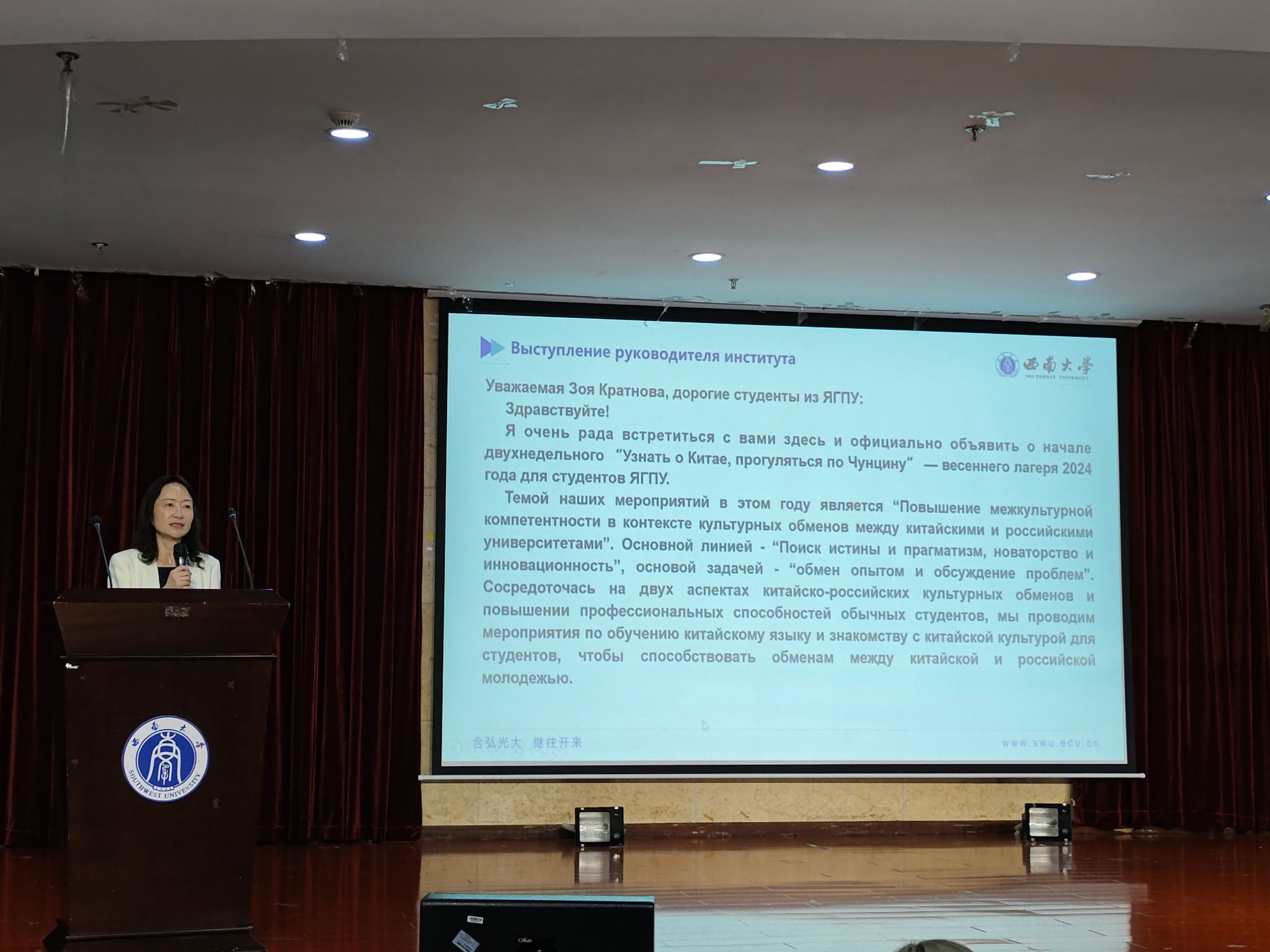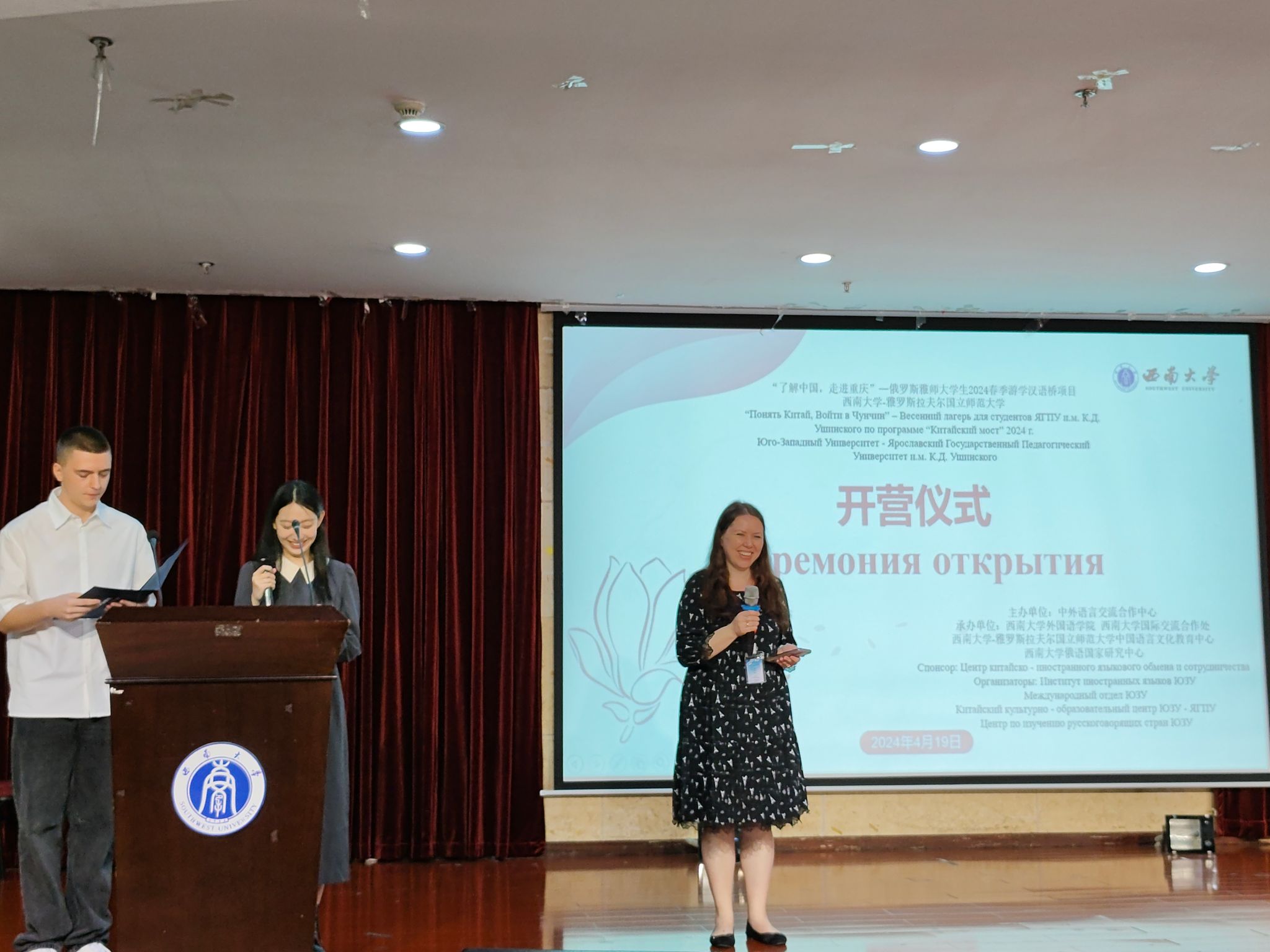 4月19日上午9时,由教育部中外语言交流合作中心主办,俄罗斯雅罗斯拉夫尔国立师范大学(以下简称“雅师大”)大学生参加的“了解中国、走进重庆”2024年“汉语桥”项目外国学生春令营活动在Beat365中文官方网站外国语学院101报告厅拉开序幕。Beat365中文官方网站国际合作与交流处代远鸿副处长,外国语学院党委书记徐天虹、副书记纪委书记李晓畅、俄语系主任谢周教授、俄语系外教叶莲娜·鲍尔德列娃教授、奥尔加·卡兹敏娜副教授以及俄方带队老师卓雅·克拉特诺娃、全体营员等出席了本次开营仪式。
