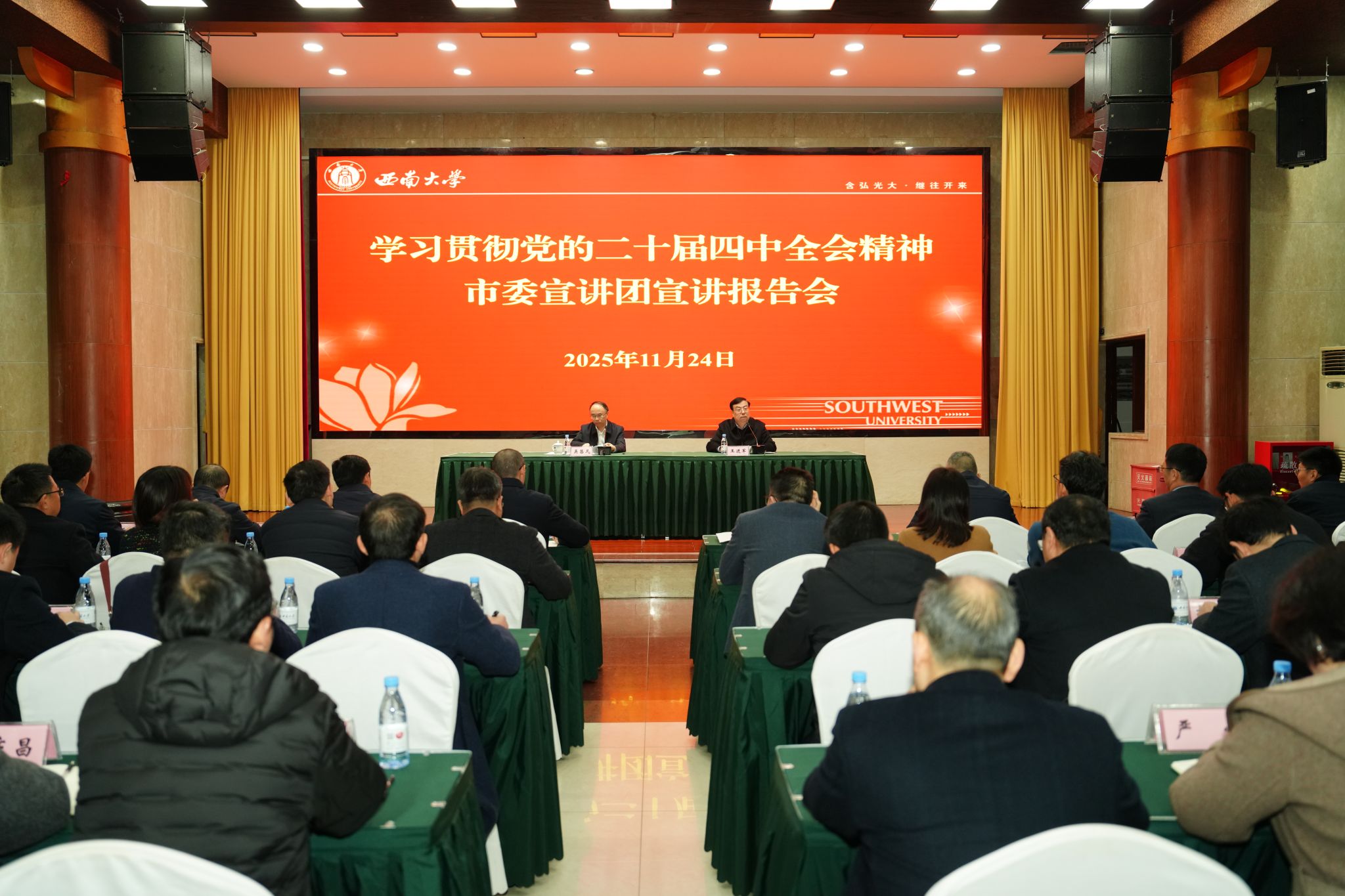 11月24日上午,学习贯彻党的二十届四中全会精神市委宣讲团宣讲报告会在学校举行。市委宣讲团成员、市委宣传部副部长吴昌凡作宣讲报告。校长、党委副书记王进军主持会议并讲话。